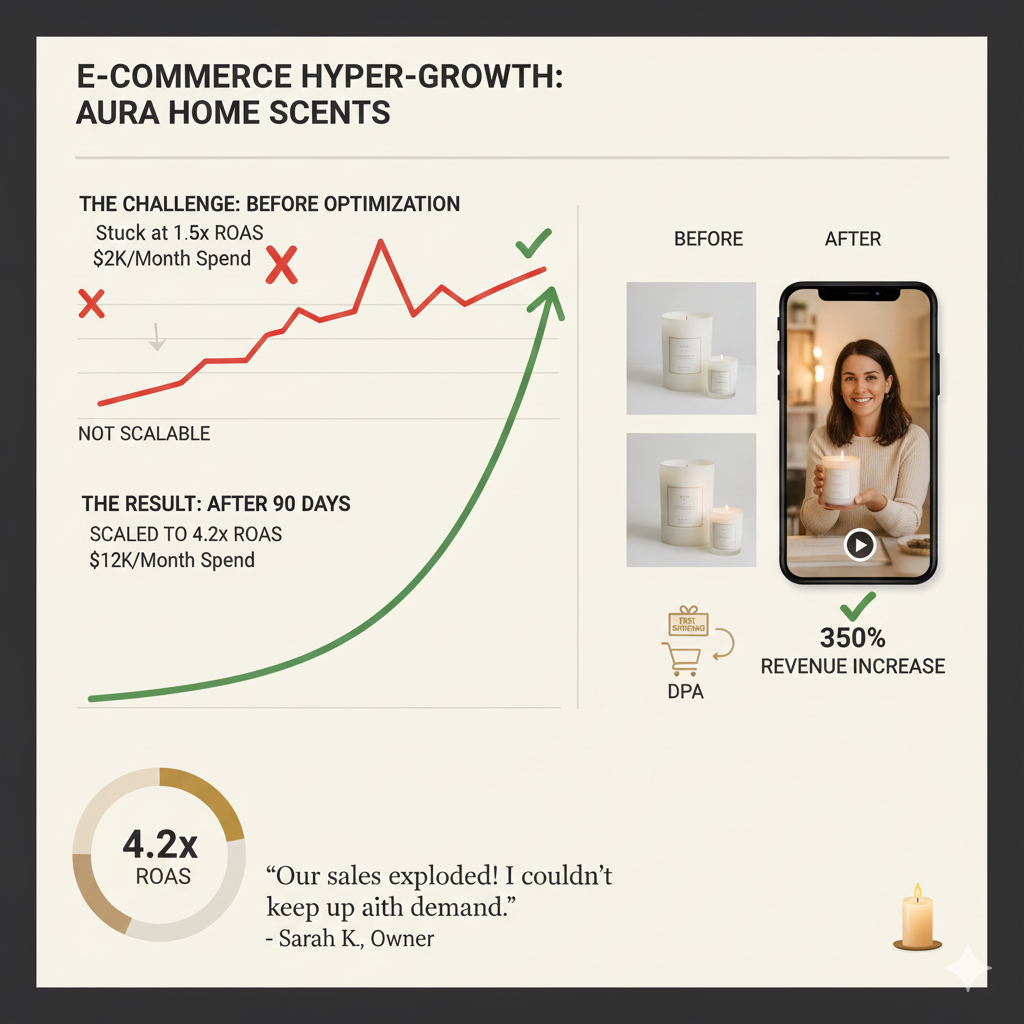 After six months of running ads in-house, Aura Home Scents was stuck at a $2,000/month spend with a $1.5\times$ ROAS. Every time they tried to increase the budget, their return dropped significantly, making the business barely break-even.
