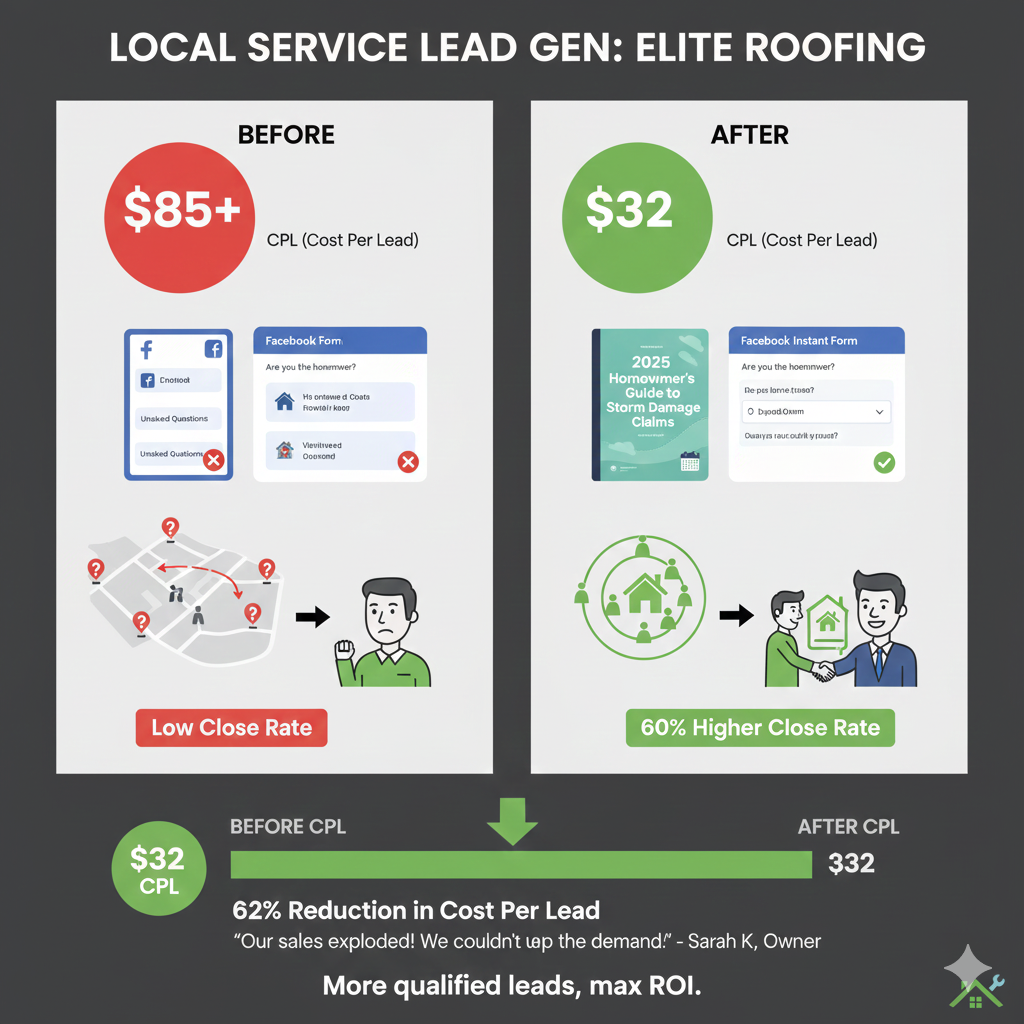 Elite Roofing was paying over $85 per lead using generic Facebook lead forms. Many leads were "tyre kickers" who lived outside their service area or weren't actually homeowners, leading to a waste of the sales team’s time.